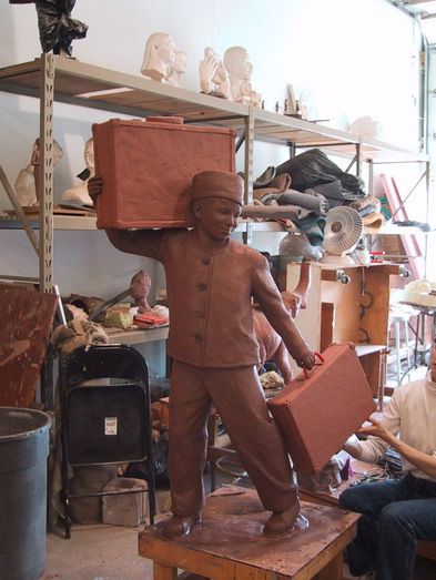Life-size sculpture created for an affordable housing development in front of an old hotel. Manitowac WI (© 2005)
